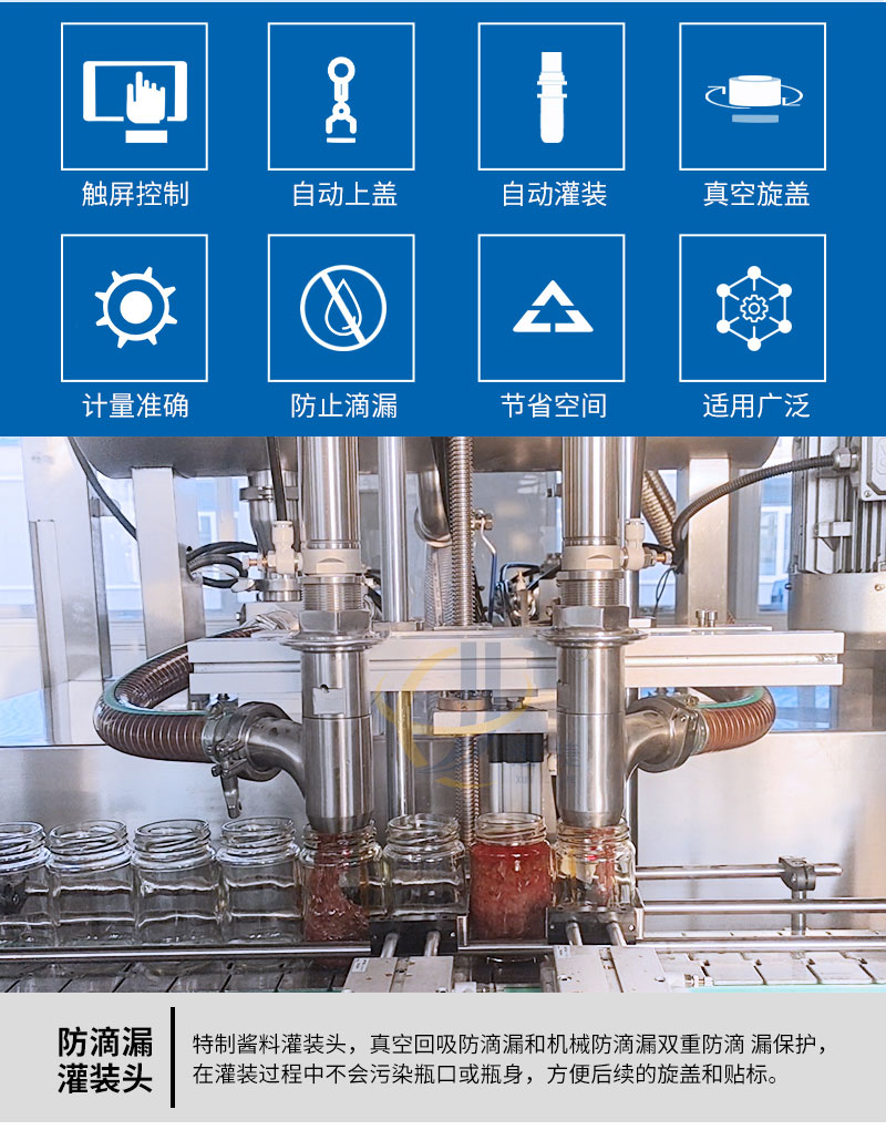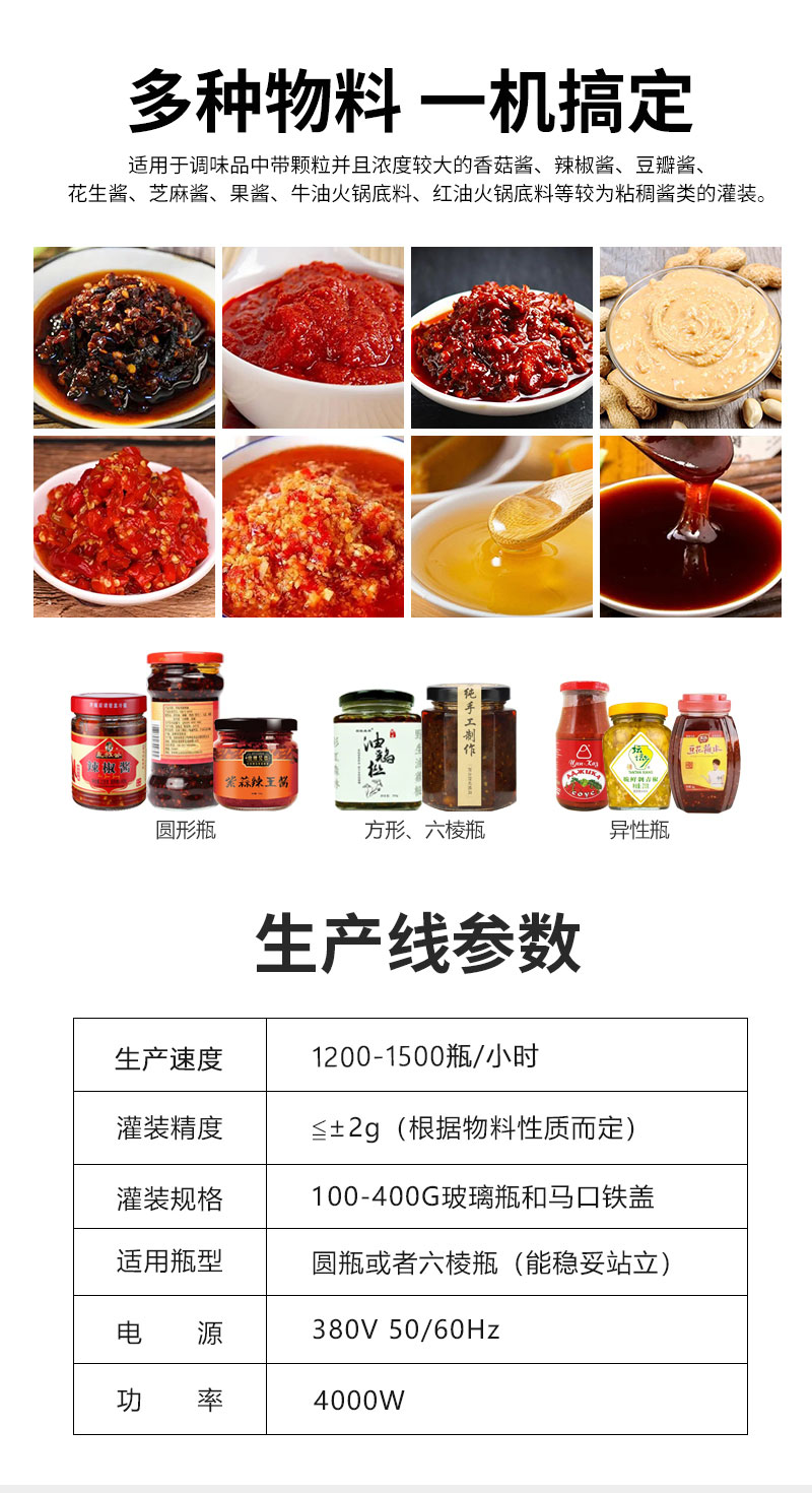 小型醬料灌裝生產線適用于調味品中帶顆粒并且濃度較大的香菇醬、辣椒醬、豆瓣醬、花生醬、芝麻醬、果醬、牛油火鍋底料