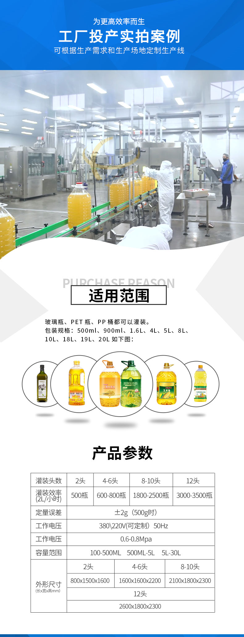 全自動食用油灌裝機適用于玻璃瓶、PET瓶、PP桶都可以灌裝。包裝規(guī)格:500ml、900ml1.6L、4L、5L、8L、10L、18L。