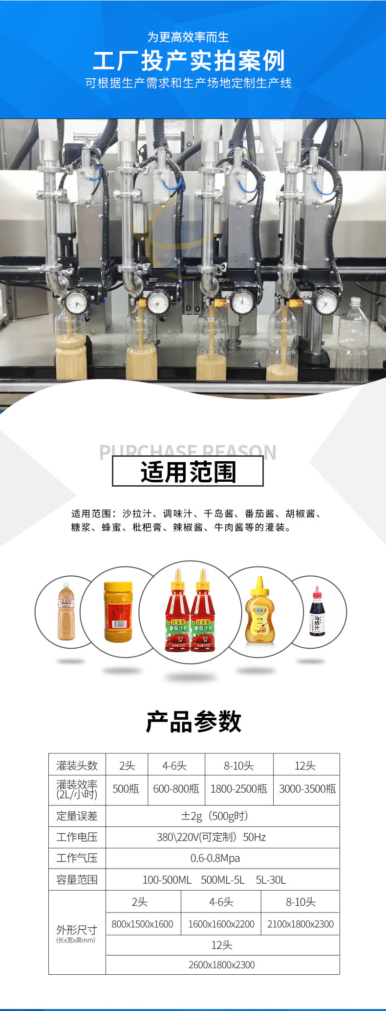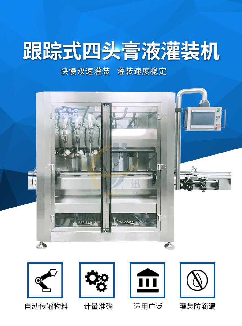追蹤式膏液灌裝機適用范圍:沙拉汁、調味汁、千島醬、番茄醬、胡椒醬、糖漿、蜂蜜、枇杷膏、辣椒醬、牛肉醬等的灌裝。