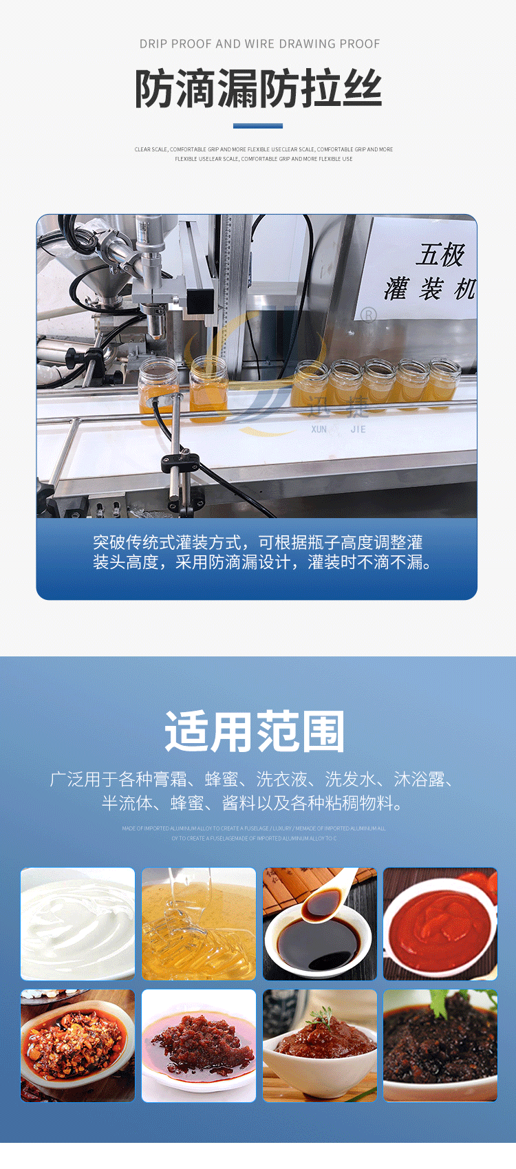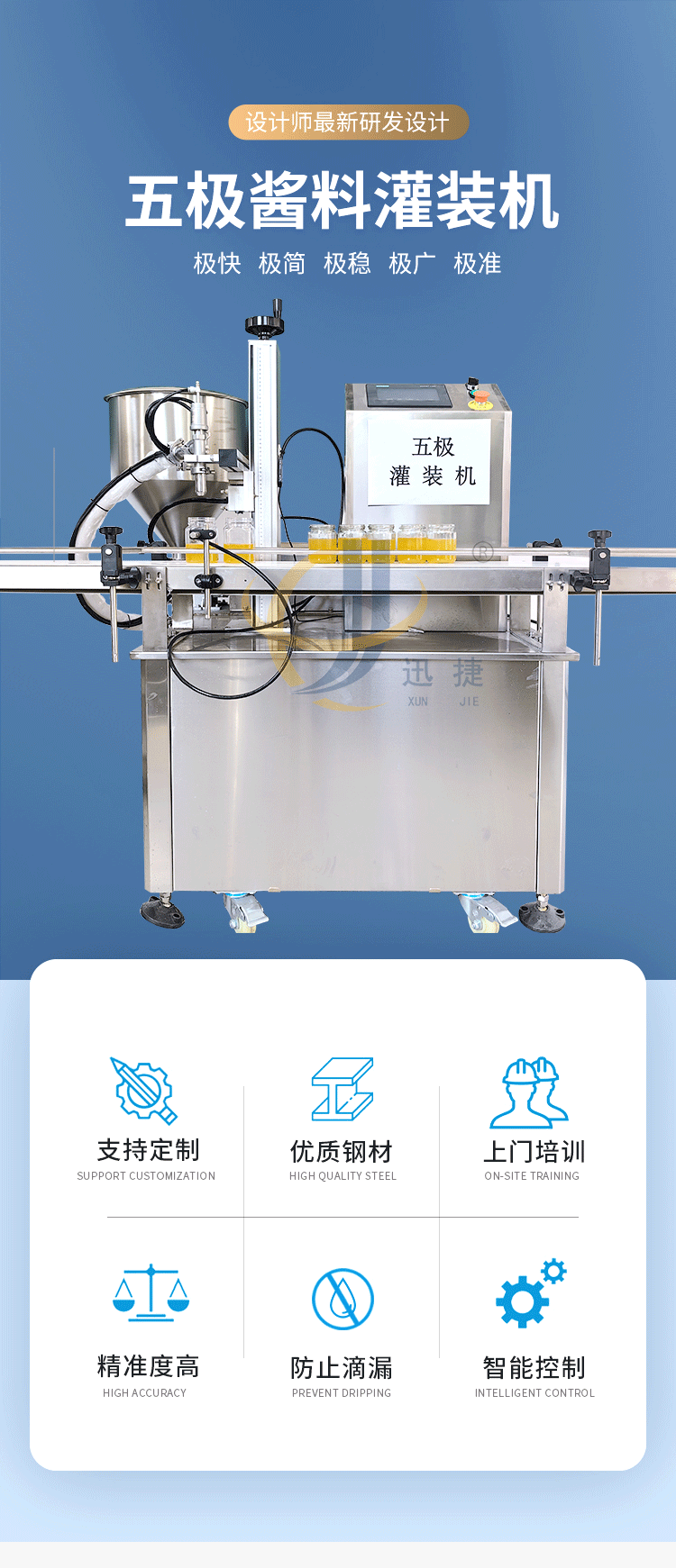 五極灌裝機:極快-單頭2200瓶/時 極簡-操作簡單 極廣-啥啥都能灌 極穩(wěn)-24小時不停機 極準-200g誤差小于1g。它可以和真空旋蓋機搭配使用。