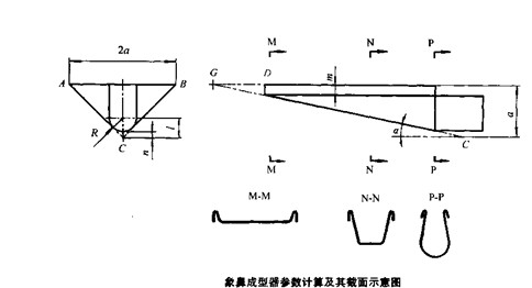 象鼻成型器的制造一般采用不銹鋼薄板,要求外表面光滑乎整。其三角部分和圓弧槽部分可用整塊板料卷曲而成,因為它們的展開寬度是相等的。下圖所示是象鼻成型器結(jié)構(gòu)及展開圖,沿虛線卷折即可制得成型器,圖中參數(shù)可通過計算加以選擇。